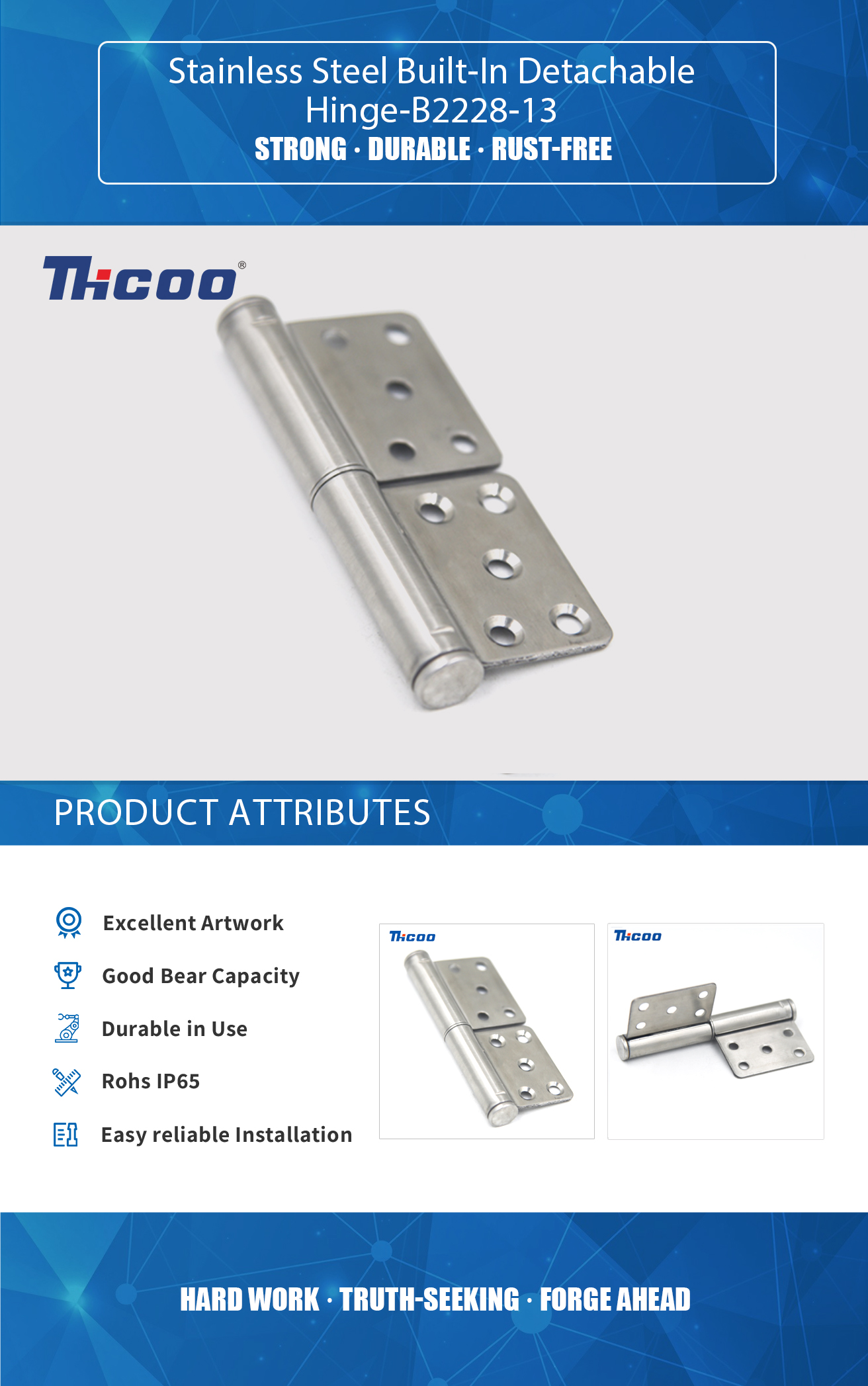 Tá ár saotharlann tástála féin againn agus an trealamh iniúchta chun cinn agus iomlán, ar féidir leo cáilíocht na dtáirgí a chinntiú. Is cineál hinge é Hinge Inscortha Tógtha-B2228-13 Cruach Dhosmálta atá déanta as cruach dhosmálta agus atá deartha le bheith tógtha isteach i réad, mar shampla doras nó comh-aireachta, agus na duilleoga hinge i bhfolach nó i bhfolach nuair a bhíonn an réad. dúnta.