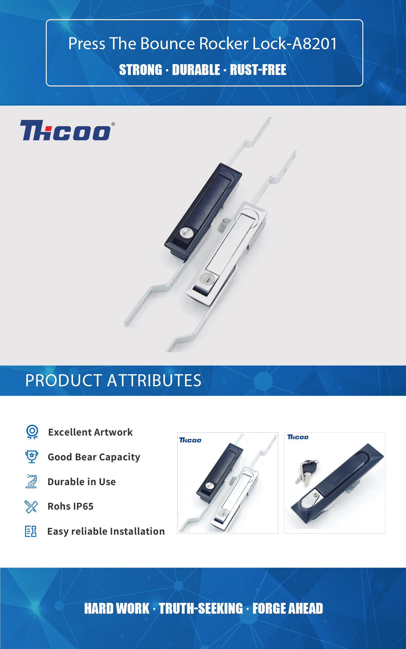 Tá ár saotharlann tástála féin againn agus an trealamh iniúchta iomlán agus casta, ar féidir leo cáilíocht na dtáirgí a chinntiú.Press Tá an Preab Rocker Lock-A8201 éasca le húsáid, le meicníocht shimplí brúigh síos a éilíonn iarracht íosta a oscailt. atá dlúth agus éadrom de ghnáth, rud a fhágann go bhfuil siad éasca iad a iompar agus a shuiteáil. D'fhéadfadh siad a bheith oiriúnach le húsáid i réimse feidhmeanna, lena n-áirítear socruithe cónaithe, tráchtála agus tionsclaíocha.